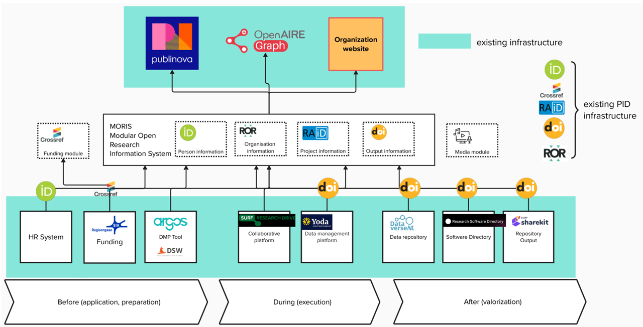 MORIS koppelt met bronsystemen, PID-infrastructuren en externe publicatiekanalen zoals Publinova, OpenAIRE Graph en instellingswebsites. Deze aanpak maakt de infrastructuur schaalbaar, modulair en compatibel met uiteenlopende technische omgevingen.